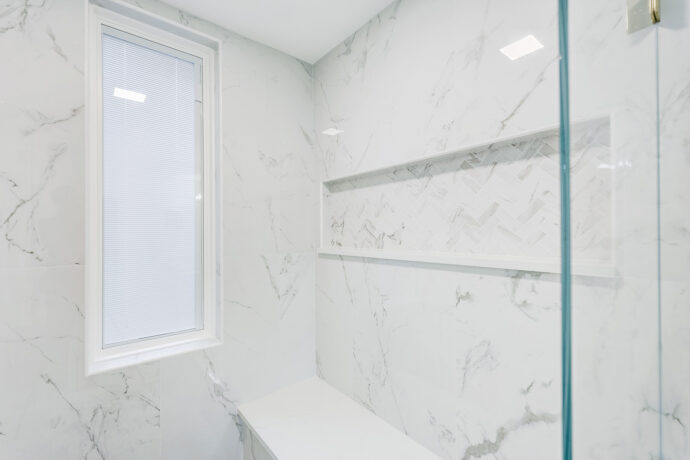 The space features premium marble tile throughout, bringing timeless character and a clean, upscale finish to both the walls and flooring. A large custom shower niche and integrated bench provide both functionality and visual balance, creating a spa-like bathroom experience in Birmingham MI. The new vanity is carefully designed and installed to complement the overall aesthetic while maximizing storage and usability.