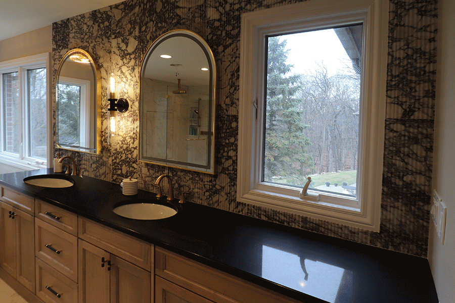 This Rochester bathroom remodel exudes a calming, spa-like atmosphere with elevated design details. The wall backsplash extends all the way to the ceiling, creating a striking focal point that enhances the room’s height and elegance. A freestanding soaking tub invites relaxation, while the beautifully tiled glass shower adds both texture and sophistication. The many windows fill the space with natural light, highlighting the textures and finishes while enhancing the spa-like, open, and airy feel. Every element was thoughtfully chosen to blend serenity, luxury, and modern craftsmanship.